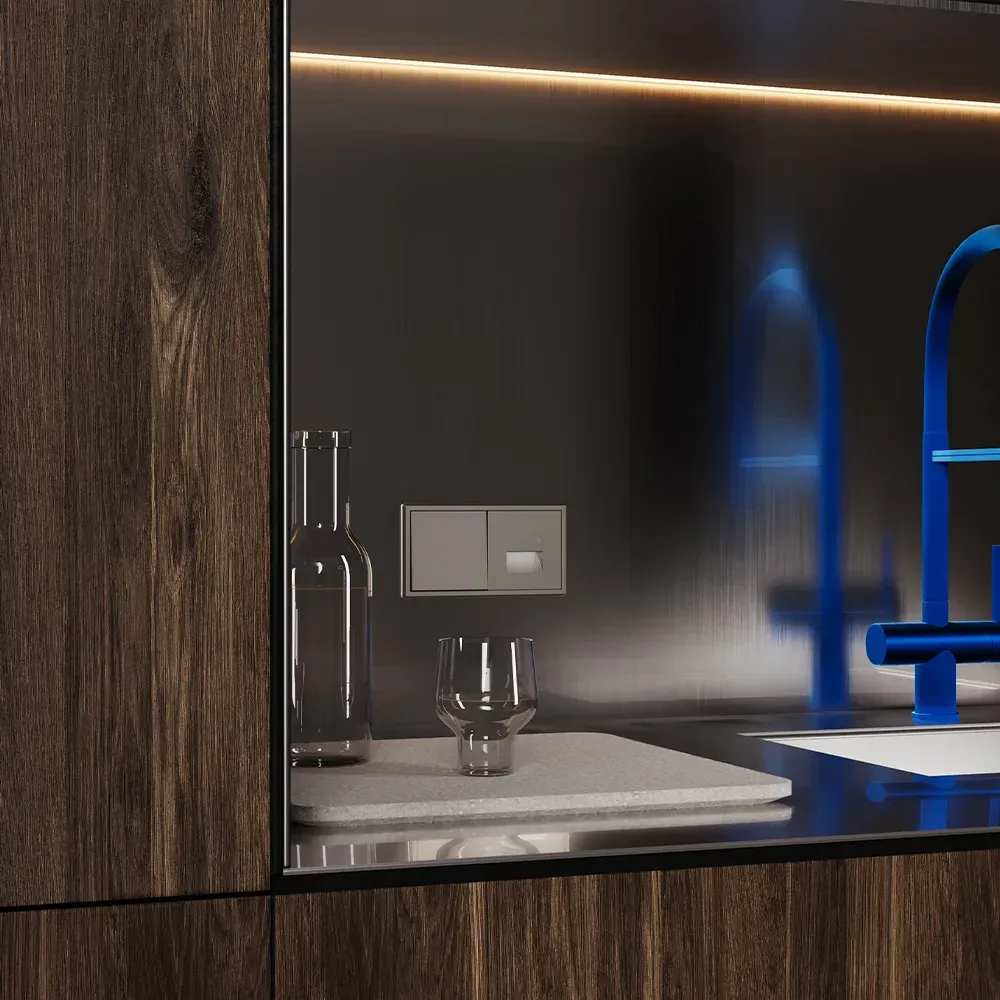 • Кухня — тёплый оттенок создаёт уютную атмосферу, идеально дополняя деревянные фасады и кофейную зону